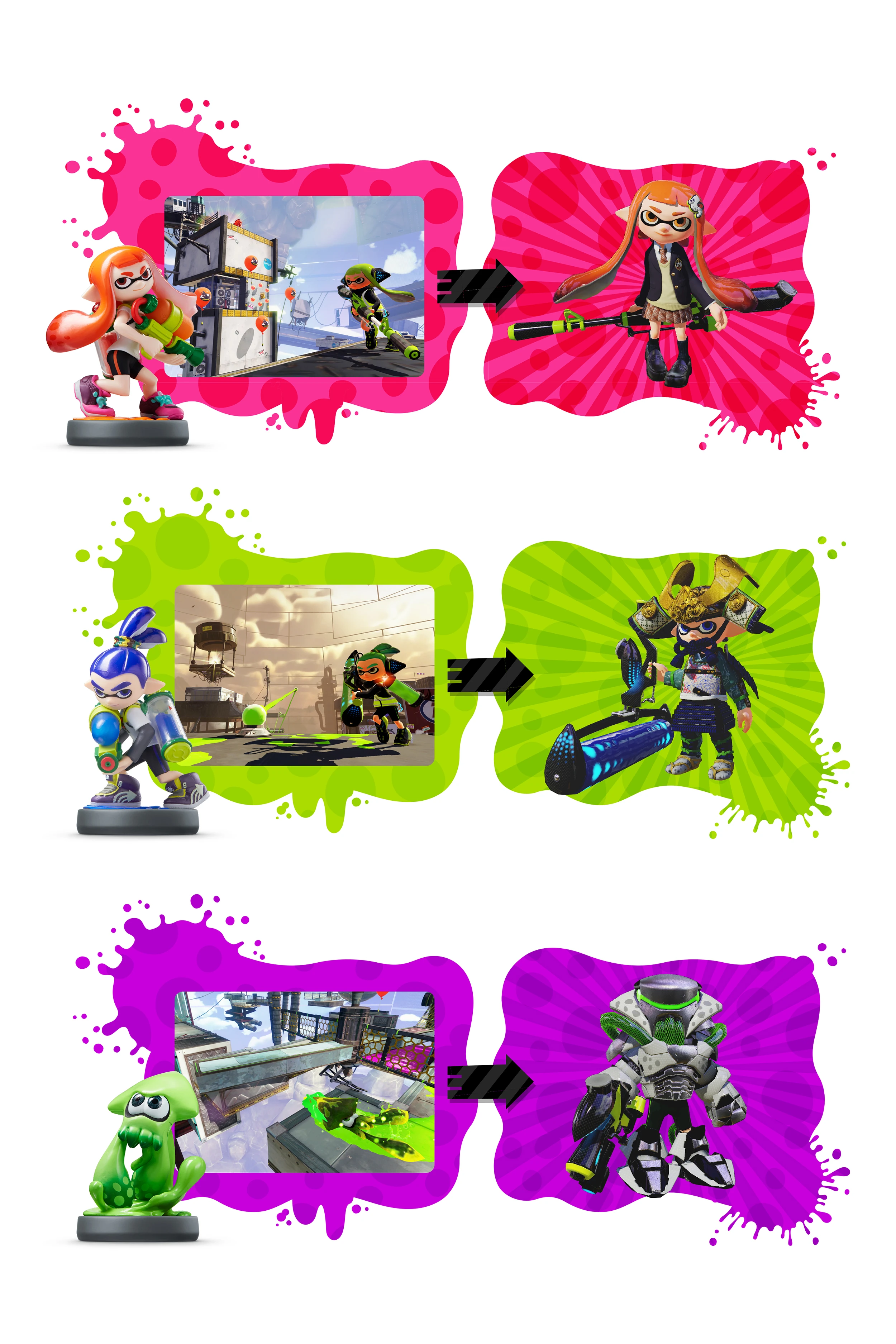 Mit dem Release von Splatoon erschienen auch drei verschiedene Splatoonamiibo-Figuren. Zwei davon sind separat zum Preis von 15 Euro erhältlich, der Inkling-Junge und das Inkling-Mädchen. Die Inkling-Squid Figur war nur in der Special-Edition im Bundle mit dem Spiel in Deutschland zu erwerben, mittlerweile ist er aus separat erhältlich. In Japan und Nord-Amerika sind alle drei Amiibo-Figuren außerdem in einem Bundle erhältlich.