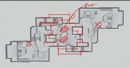 - Die Mitte - Es gibt wenige Orte, um sich zu verstecken und kaum Wege unbemerkt in die gegnerische Hälfte zu gelangen ohne durch den großen mittleren Gang zu gehen, daher ist die Kontrolle des Grabens von großer Wichtigkeit für weiteres vorstoßen.
