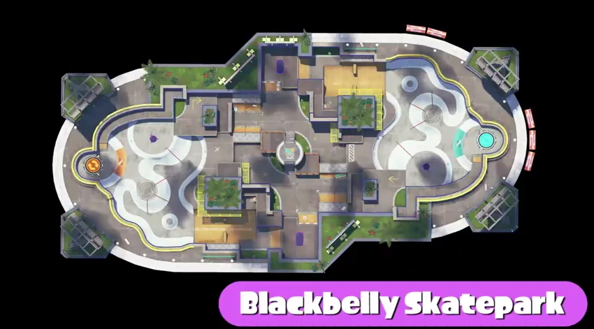 Typisch für einen Skatepark, besitzt diese Arena viele Rampen und Hügel. In der Mitte der Arena befindet sich eine Plattform, die nur durch Schwimmen erklommen werden kann. Im Herrschaftsmodus gibt es hier zwei Splatterzonen,. Sie sind eher klein und befinden sich neben der großen Plattform in der Mitte. Zusätzlich gibt es auch seitliche Wege um in die Mitte zu kommen.