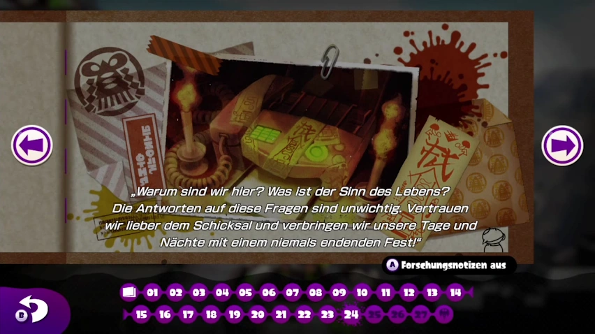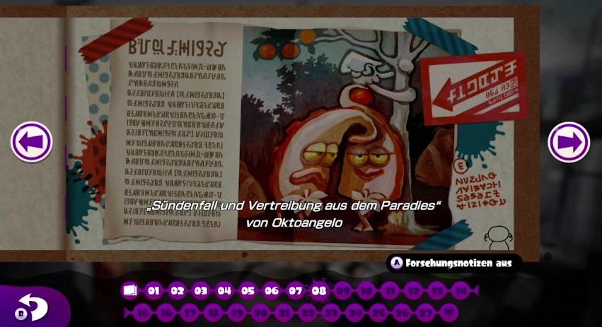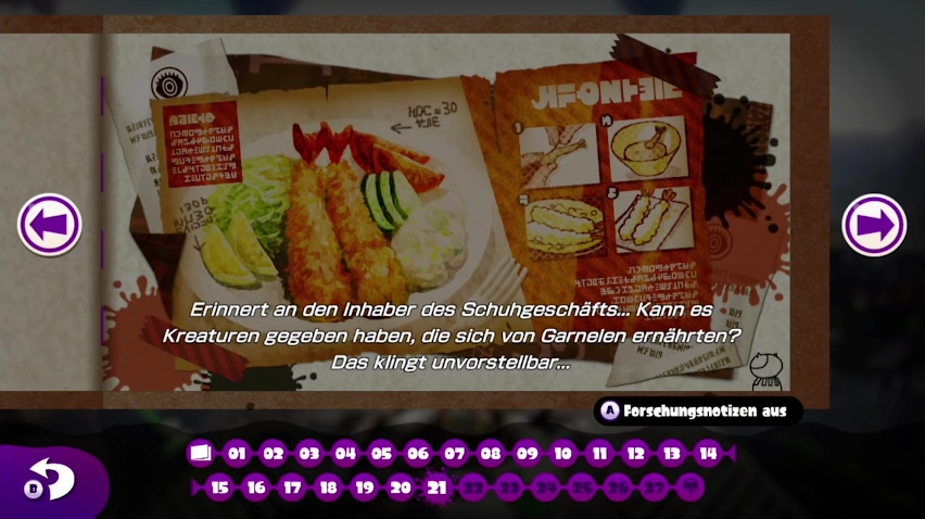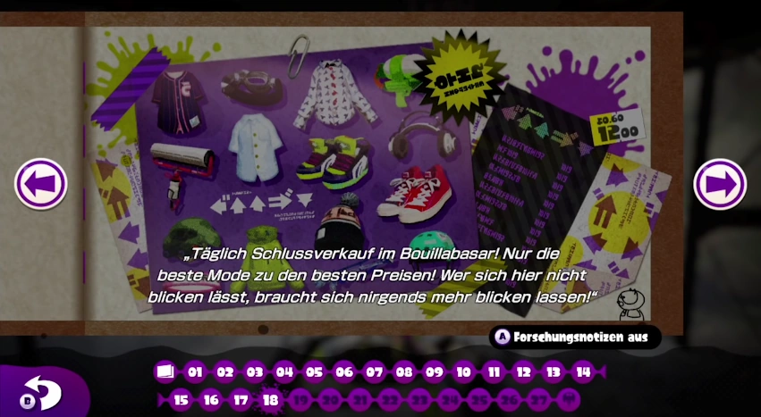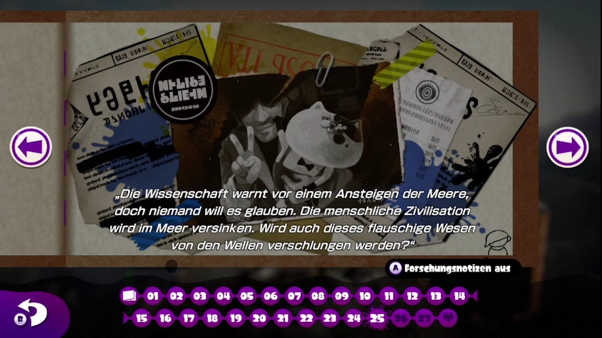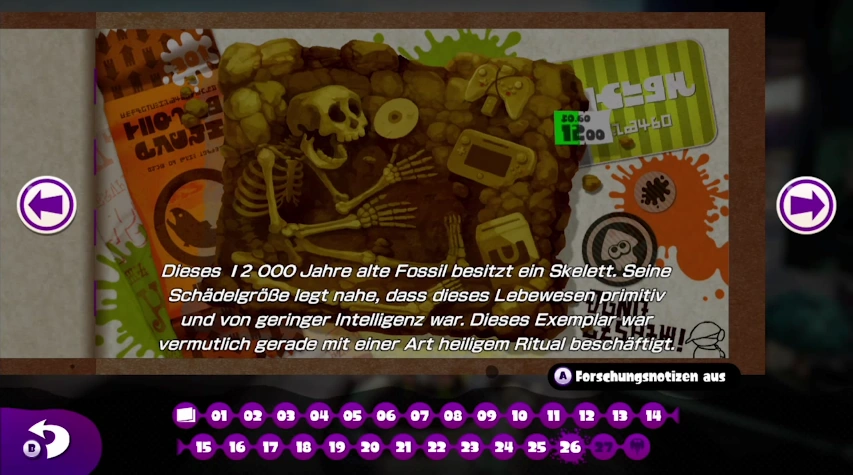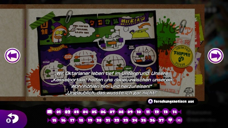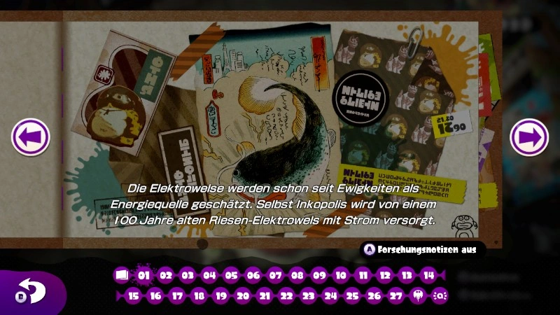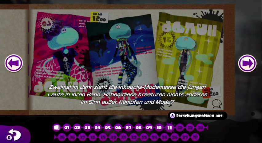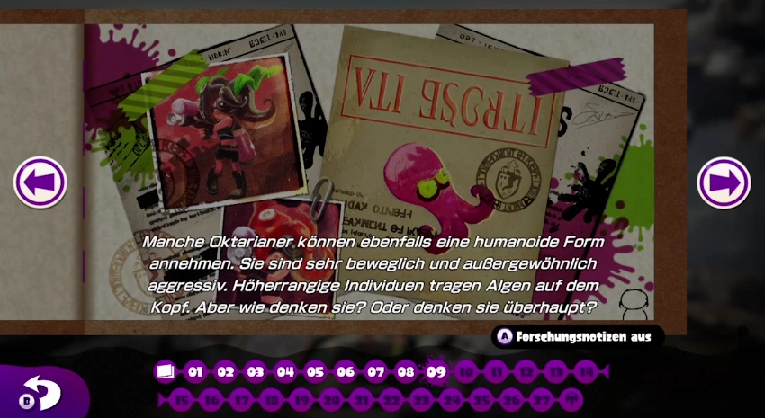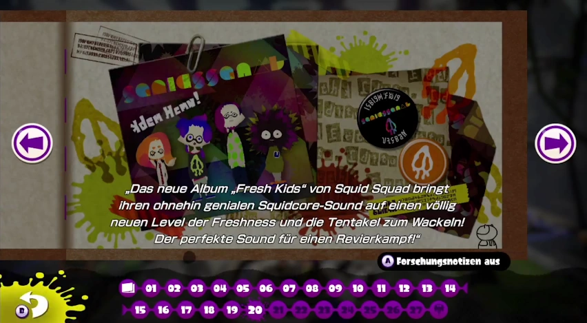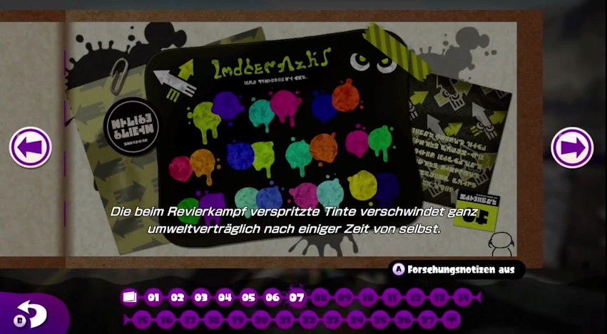 - Text DE:„Die furchterregende Biologie der Inklinge!“„Gliedmaßen: Sprung bis zu 150 cm"„Skelett: keines“„Gehirn: simpel und auf „Spaß“ ausgelegt“ „Augen: erkennen Beute bis 100 m“„ Tinte: hochkomprimiert“