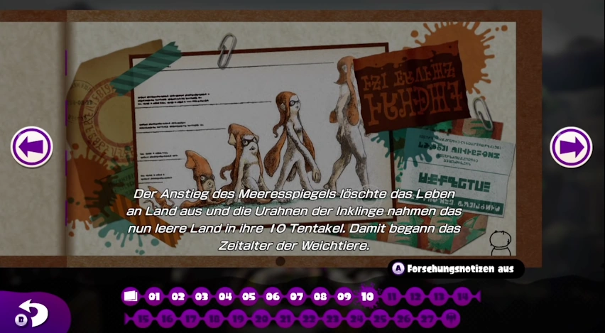- Text DE:Der Anstieg des Meeresspiegels löschte das Leben an Land aus und die Urahnen der Inklinge nahmen das nun leere Land in ihre 10 Tentakel. Damit begann das Zeitalter der Weichtiere.