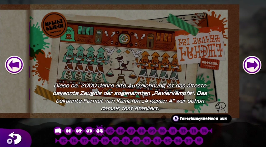 - Text EU/USA:"This scroll was found in a deep rock layer, its age estimated at approximately 2,000 years. It details the ancient Turf Wars of the time. It seems the ancient four-versus-four battle format had already been established at this stage."