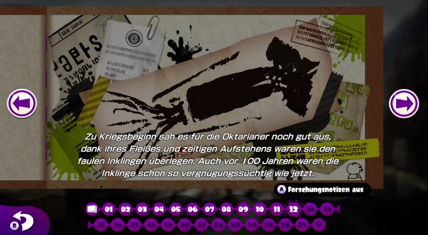 - Text DE:Zu Kriegsbeginn sah es für die Oktarianer noch gut aus, dank ihres Fleißes und zeitigen Aufstehens waren sie den faulen Inklingen überlegen. Auch vor 100 Jahren waren die Inklinge schon so vergnügungssüchtig wie jetzt.