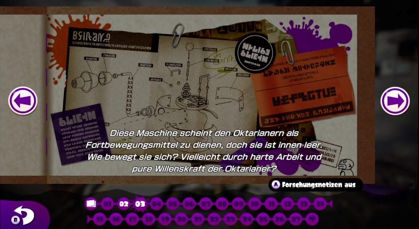 - Text EU:"This appears to be a machine designed for Octarians to ride, but there is nothing inside. The big question is then...how does it move? Perhaps the Octarians are able to power it through hard work and willpower alone...?"