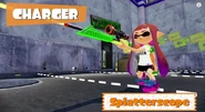 | “ | The Splatterscope is identical to the Splat Charger, but is equipped with a scope for slightly greater long-range precision. To avoid getting blindsided, only peer through the scope prior to firing. If you find yourself under attack at close range, use the Bomb Rush special to make your escape, tossing Splat Bombs to put some distance between yourself and your attackers. | ” |