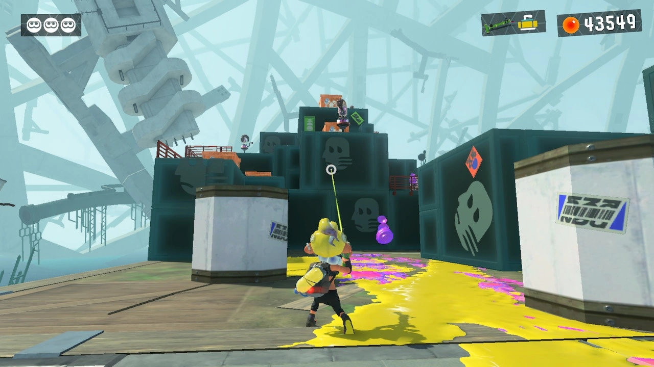Use the sponge to climb up to a set of three Octotroopers. Follow the narrow path, using the sponges as cover while advancing through several more groups of Octotroopers. On the way, there will be a box on your left with a Trizooka. Soon after, you will reach the goal.