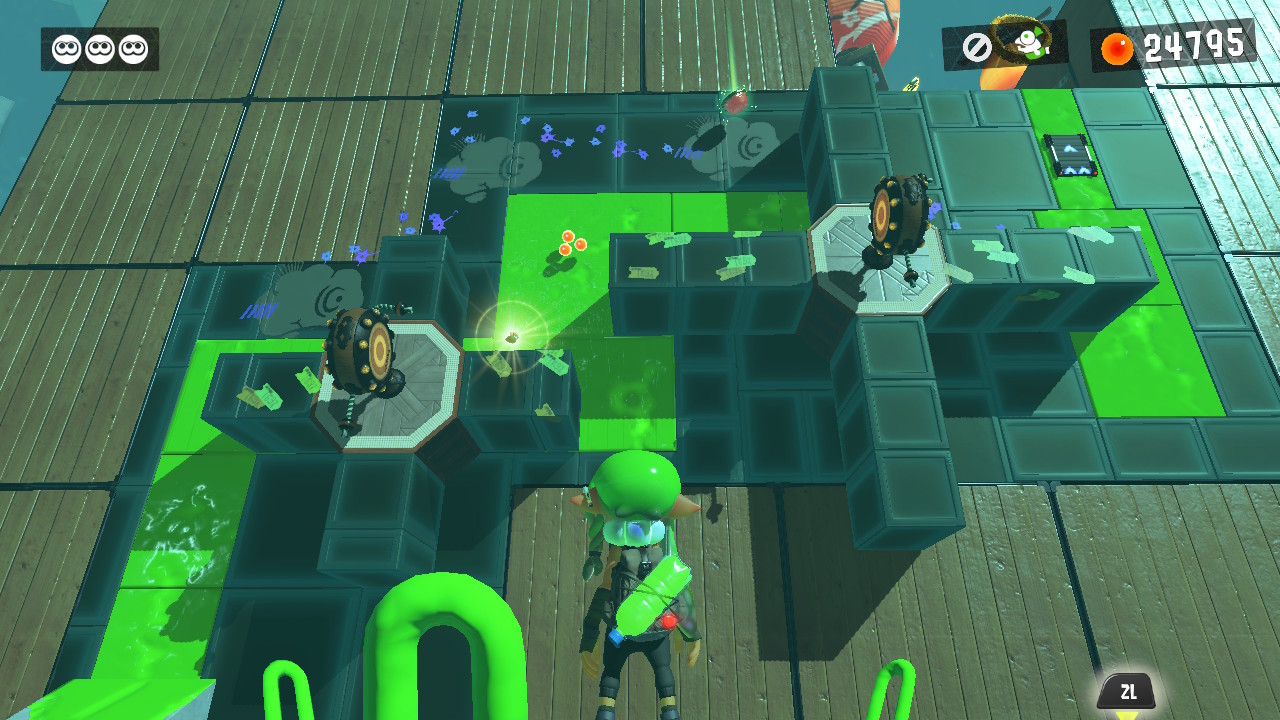 Next you need to climb a wall with two rotating mechanisms, activated by Ink Switches. Swim up onto the first mechanism and throw Little Buddy at the Ink Switch, this will start rotating the mechanism, allowing you to reach more inked wall and the second mechanism. Call Little Buddy back to you and repeat to reach an upward dash track that will boost you through a Squid Ring and to the goal.