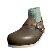 The Choco Clogs appear to be chocolate brown clogs with a brown strap. They also have a gray leg cuff and tan trim. The shoes do not change with the player's ink color.