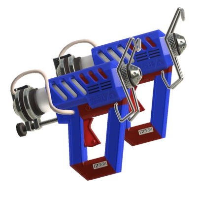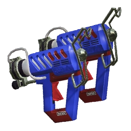 These Dualies are based on hot glue guns (hence the name), and have a complex design. The main color scheme is blue and red, but there are some metallic parts too. On the back there is a glue stick with a cap on it. At the end of that cap, there is a tube connecting to the main body. Under the cap, there is a bar to seemingly guide the glue stick along. To represent the part of the hot glue gun that keeps the tip from burning a surface while it sits somewhere, the Glooga Dualies have excessive metal decorations connected just below the tip.