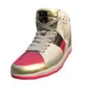 The Pearlescent Squidkid IV use the same core color pallet as their namesake Pearl Houzuki. The shoes are a matching pair of primarily white shoes with white laces. The shoes have pink soles and toes while the tongue, heel and front of toes are a metallic gold color. On each shoe tongue has the Enperry logo.