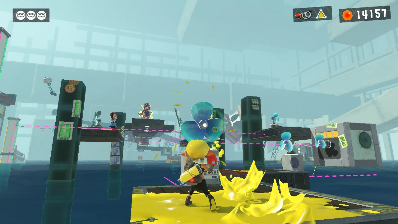 Ahead will be a large ceiling with no floor beneath it. Directly in front of you will be a propeller that will make the ceiling descend below you. On top of it will be several Octotroopers and a Shielded Octotrooper, and above will be a Power Egg Pack which you can jump to before the area starts rising again. Next, you will find another propeller protruding upwards; shoot it to lower the propellervator downwards, and watch out for two Octocopters on the right. Use the next propellervator on the right to reach the third checkpoint.
