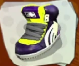 The Purple Hi-Horses are purple shoes with a yellow pattern on the front. There is also a white arcing pattern on the sides and back, and the shoes appear to be too big for the player's feet. The laces are also a dark gray. The color of the shoes does not change with the player's ink color.