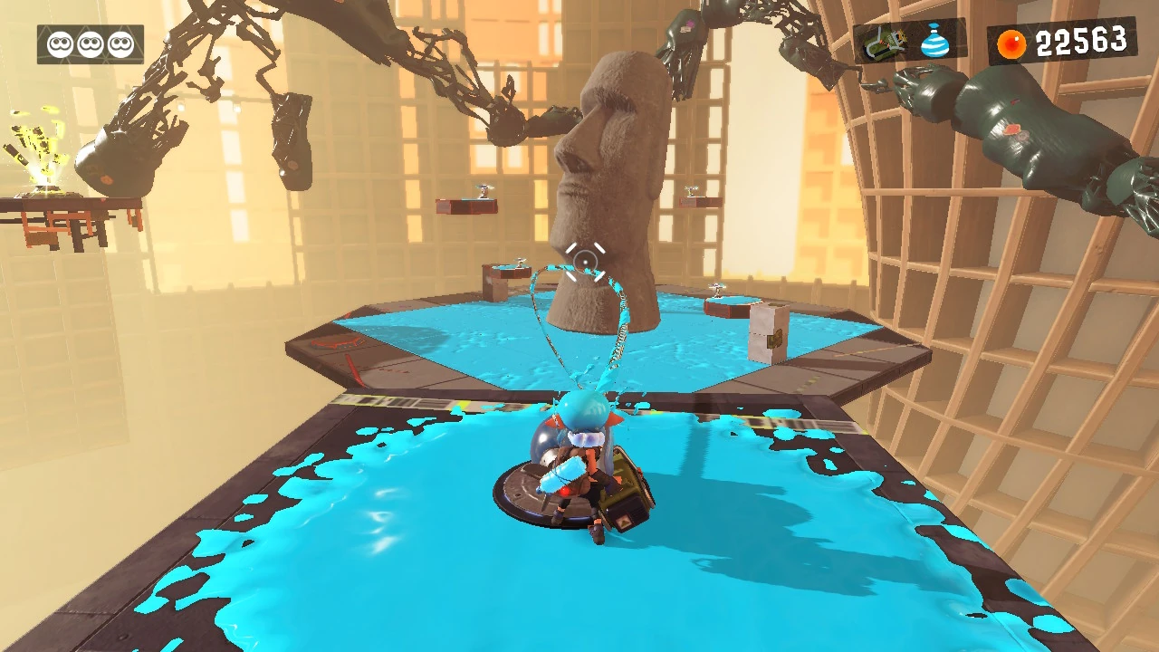 Use the ride rail to reach the main area with a statue in the center. Your objective to is to cover the statue with ink, however you currently can't reach the top of the statue. Once you have inked twenty percent of the statue, some platforms will spawn allowing you to ink the rest. When the statue is covered, a Launchpad will spawn that will take you to the goal.