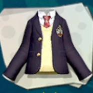 The School Uniform appears to be a black school jacket over a pale yellow sweater with a red tie. The female version comes with a orange and white plaid skirt. On the left there is shown to be a badge or emblem design.