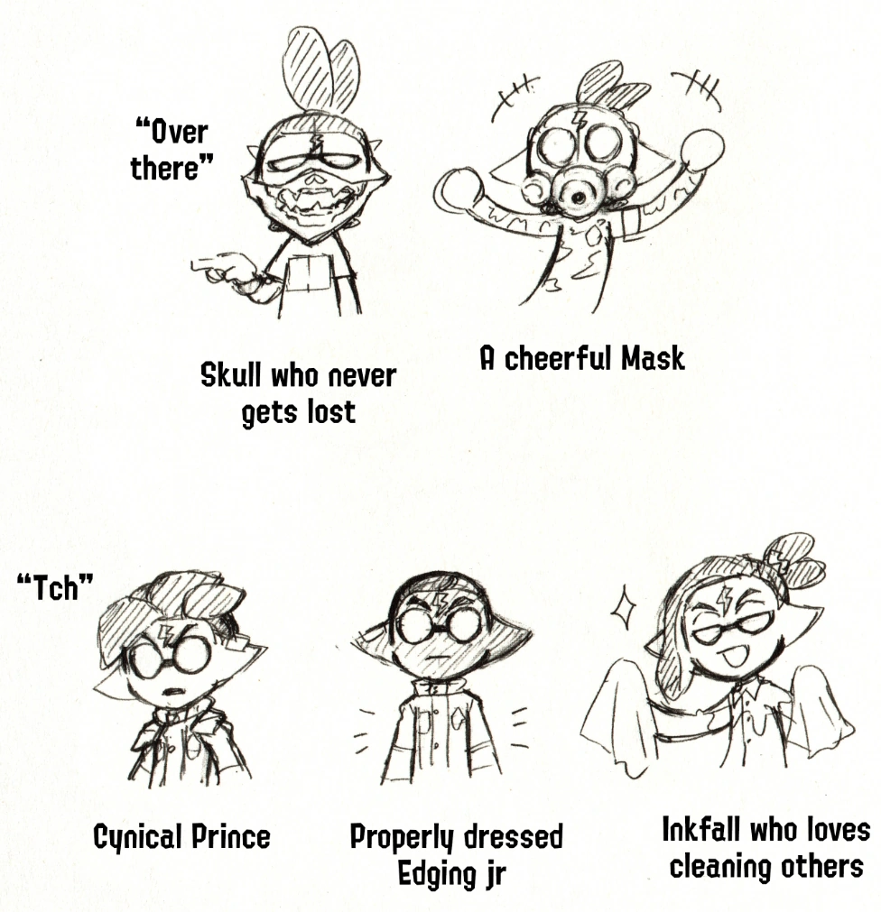 S. Skull never gets lost while Skull always does, S. Mask is Cheerful while Mask hates cheerful people, S. Prince is cynical while Prince is kind, S. Squidkid Jr. dresses neatly while Squidkid Jr. doesn't, and S. Inkfall loves to clean others while Inkfall likes to stay clean himself. It is unsure what S. Gloves' personality would be.