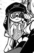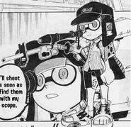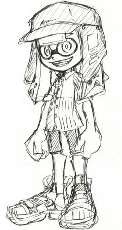 Shady is a male light-skinned Inkling with blue-green eyes and tentacles in the "Banger" hairstyle, though the color can change at will. He wears the Ink-Black Flap Cap, which is presumably where his name comes from, the Button-Clown Shirt, and the Arrow Toesies Blu. He skillfully uses the E-Liter 4K Scope as his main weapon.