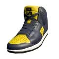 The Sun and Shade Squidkid IV are yellow shoes with dark navy coloring along the front, sides, and heels with yellow running up the front and sides. The laces are also navy and the soles are white.