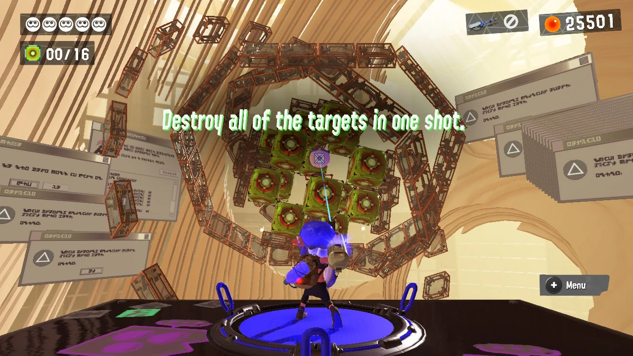 You are tasked with destroying 16 targets with a single shot for this level. You can fire off a shot without failing so long as the shot does not destroy any of the target crates, but in order to destroy all the targets in one go, you have to hit the Balloon Fish with your shot, as the explosion will take out all of the targets for you.